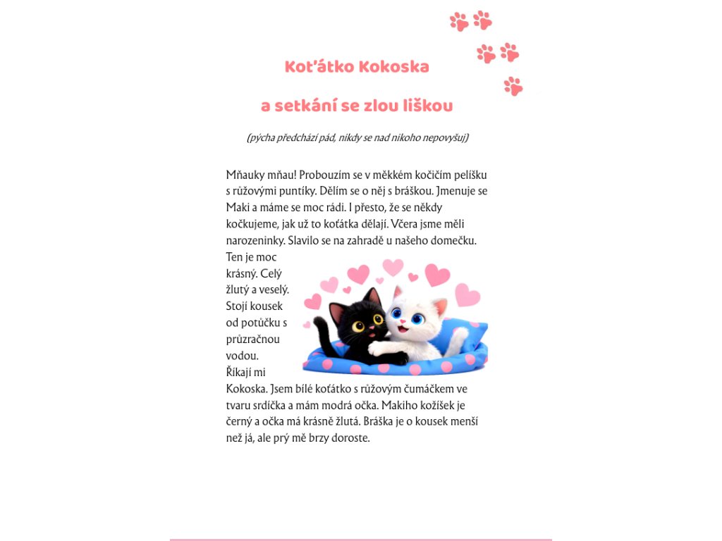 Kokoska je bílé koťátko s kouzelnou knihou, která mění osudy. Zlá liška Kokosku unese do jeskyně plné strachu a úkolů. Tam musí se zvířecími kamarády sloužit svým věznitelům. Ale zvířátka se nevzdají – najdou odvahu, víru i plán na útěk. Pomáhá jim samotný král vesmíru! Dobrodružný příběh plný napětí, kouzel a přátelství, který učí překonávat strach a věřit v dobro. Velká písmena a nádherné ilustrace potěší každého malého čtenáře. Ideální jako první čtení pro děti od 6 let. Od autorky oblíbené série o kočičce Ťapičce (Z deníku kočičky Ťapičky, Koťátka kočičky Ťapičky, Putování kočičky Ťapičky).